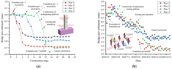 - By combining numerical simulation and measured data, we compared the settlement of the foundation pit and bridge piers caused by the main construction stages. The numerical simulation results and the measured data results were consistent, which proves the accuracy of the numerical model.