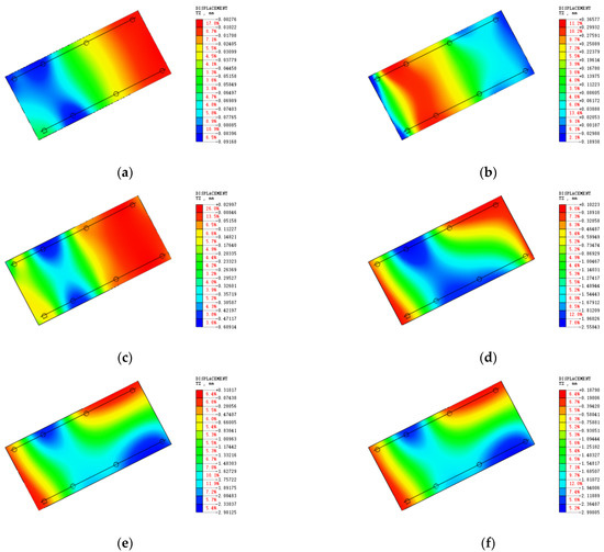 Similarly to Figure 10, which shows the settlement of the bridge deck during the construction of the underpinning pile foundation, it can be seen from Figure 9a that the diaphragm wall and the underpinning pile construction have minimal impact on the superstructure of the bridge; this is therefore not repeated below. From Figure 10b, it can be seen that soil loss during foundation pit excavation causes soil rebound inside the foundation pit, which drives the uplift deformation of the superstructure, and the maximum uplift of the bridge deck is approximately 0.37 mm; as can be seen in Figure 10c, when the underpinning bearing was poured, the new bearing settled under its own weight and the maximum settlement of the bridge deck was approximately 0.6 mm. From Figure 10d, it can be seen that the existing pile truncation construction leads to the direct transfer of the superstructure load to the underpinning bearing platform, and that due to the loss of the original pile bearing capacity, the settlement of the bridge deck becomes dramatically large, with a maximum settlement of 2.55 mm. From Figure 10e,f, it can be seen that the backfilling of the foundation pit (equivalent to soil loading) further causes a slow increase in superstructure settlement after the completion of the underpinning system, while the tunnel construction phase has almost no effect on the superstructure. The final settlement of the bridge deck was approximately 3 mm maximum (<8 mm), which satisfied the settlement control requirements.