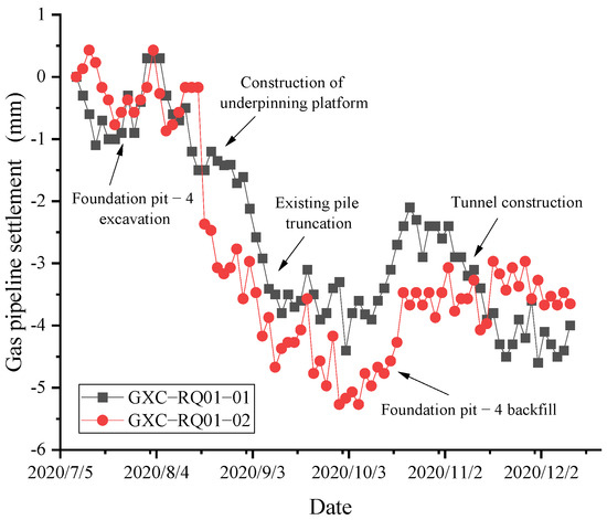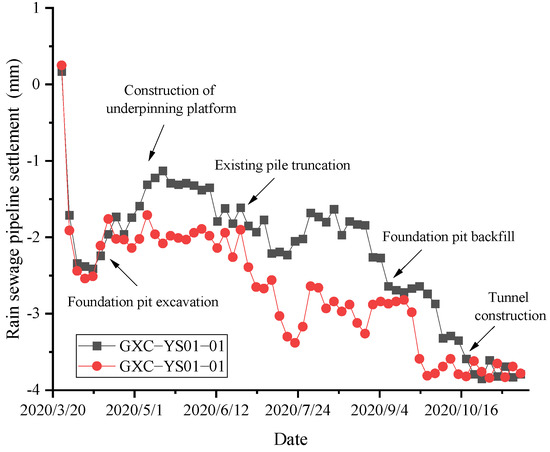 Due to the existence of a large number of pipelines around the foundation pit, the pile foundation underpinning and tunnel construction may cause a large differential settlement of the pipelines, which may lead to damage to the pipelines. In this project, the gas pipeline and rain–sewage pipeline near the foundation pit (as shown in Figure 4) were monitored using a digital level (measurement accuracy of 1 mm) of the model Trimble Dini0.3-748408. As shown in Figure 11 and Figure 12, the maximum settlement of the rain–sewage pipe is 3.85 mm, and the maximum settlement of the gas pipe is 5.27 mm. The maximum differences in the settlement of the rain–sewage pipe and gas pipe are 0.25% Lg and 0.3% Lg, which both meet the monitoring control value (Lg indicates the length of the pipe section; L indicates the distance from the center of the adjacent foundation).
