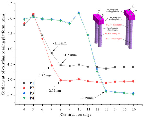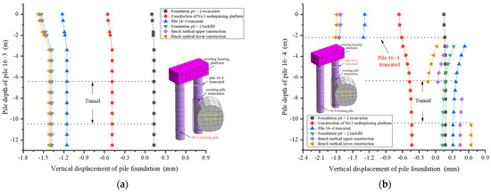 From Figure 13a, it can be seen that the settlement values of the pile tops of the existing pile 16-3 (untruncated) in the excavation of foundation pit 2, the construction of the underpinning bearing platform, the construction of the truncated existing pile, and the backfilling of foundation pit 2 are 0.1 mm, −0.55 mm, −1.22 mm, and −1.58 mm, respectively. The pile end settlement values are 0.13 mm, −0.49 mm, −1.15 mm, and −1.42 mm, respectively. The pile settlement is continuously varying; the settlement at the top of the pile is greater than the settlement at the end of the pile because it is in the upper-soft and lower-hard stratum (miscellaneous fill and medium-weathered limestone). The 16-3 existing pile settlement changes the most in the existing pile truncation construction stage; this stage of settlement accounts for 0.42% of the total settlement. From Figure 13b, it can be seen that the settlement change in the existing pile (truncated) No. 16-4 in the excavation stage of foundation pit 2 and the construction stage of the underpinning bearing platform is similar to that in Figure 13a, while in the construction stages of the truncation of the existing pile, the backfilling of foundation pit 2, and the breaking of the upper and lower step pile foundation, etc., the settlement change in the pile is discontinuous and can be divided into two parts from the truncated position of the existing pile, with settlement occurring at the top and uplift at the bottom. The maximum settlement of 1.81 mm occurs at the top of the pile. Comparing the maximum settlement of the existing piles in Figure 13a,b, the settlement of the truncated existing piles is slightly larger than the settlement of the untruncated existing piles, and uneven settlement occurs on both sides of the existing bearing platform.