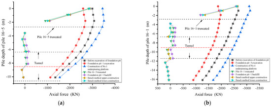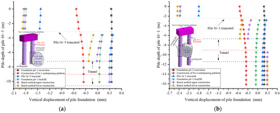 Comparing Figure 14a,b, it can be seen that the excavation phase of the foundation pit caused the upward displacement of the existing piles, with pile 16-5 bulging by approximately 0.35 mm and pile 16-1 bulging by approximately 0.2 mm; during the construction stage of the underpinning bearing platform, the existing piles settled under the self-weight of the underpinning bearing platform, and the settlement of the existing piles slowly decreased from top to bottom due to the action of pile side friction. The maximum settlement of the top of the existing pile is approximately 0.54 mm and the maximum settlement of the end of the existing pile is approximately 0.35 mm. With the truncation of the existing piles, the loss of bearing capacity at the end of the existing piles leads to the deformation of the superstructure; at this time, the upper load produces stress redistribution and is transferred to the underpinning structure, which mainly bears the upper structure load. The overall vertical displacement of the existing pile from the location of pile truncation can be divided into two parts: in the upper part, settlement occurs, with a 16-5 and 16-1 pile settlement of 1.45 mm and 1.82 mm, respectively; the lower part does not bear the upper load (equivalent to unloading) of the issued bulge, with a 16-5 and 16-1 pile bulge of 0.3 mm and 0.15 mm, respectively. In the foundation pit backfill stage, the upper part of the existing pile still bearing the load continues to produce settlement, with a 16-5 and 16-1 pile settlement of 1.81 mm and 2.37 mm, respectively, and the lower part of the existing pile no longer bears the load, which is slowly stabilized with a settlement amount close to 0. Then, pile foundation underpinning can be considered to be completed, with the upper part of the load having been transferred to the underpinning bearing platform and the underpinning pile. During the tunnel construction phase, the settlement of the existing piles stabilized when the tunnel passed through the barrier pile and was removed, with a maximum settlement of 2.46 mm (pile 16-1). The difference between the 16-5 and 16-1 existing pile settlements is large because the No. 4 existing bearing platform in the existing pile truncation needs to remove these two existing piles. The existing pile bearing capacity loss is greater; therefore, the settlement of the existing pile 16-1 is also even greater.