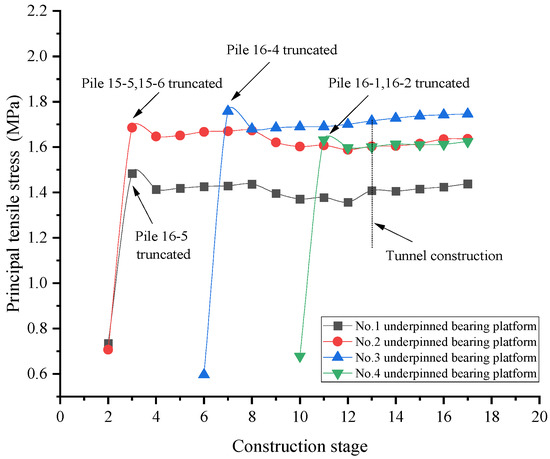 Maximum tensile stress of underpinned bearing platform at different construction stages.