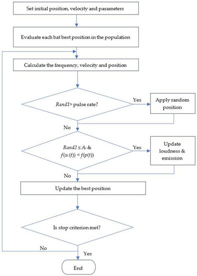 The bat algorithm (see Figure 2) is a swarm intelligence algorithm inspired by the echolocation produced by bats when interacting with their surroundings [23]. The echolocation starts with the emission of short and loud sound waves released by bats to identify their prey, obstacles or resting cracks in the dark. The time-lapse for the emitted sound to bounce back reveals the prey’s distance, direction and speed. All bats use echolocation to measure distance and distinguish between targets and obstacles [39]. The algorithm keeps a record of the bat’s velocity, position, frequency, varying wavelength, loudness and pulse emission. The loudness is measured in the range between Amin and A0, while the pulse emission is logged between 0 and 1, where 0 represents no pulse, and 1 refers to the highest rate of the bat’s emission. The bat algorithm is suitable to handle both continuous and discrete optimization matters. One of the advantages of this algorithm is the ability to reach quick convergence at the initial stage and shift from exploration to exploitation when optimality is near [40].