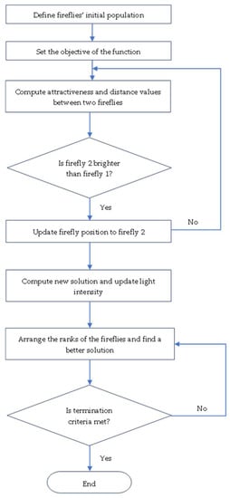 The firefly algorithm (see Figure 3) is considered a swarm intelligence algorithm that originated from the flickering behaviors of insects. It is a popular algorithm in the swarm intelligence domain [42]. Flashlight without gender distinction is simulated to entice fireflies with less brightness to draw toward the individual. Under this algorithm (see Figure 3), two significant features are considered, mainly brightness and attractiveness. The brightness echoes the firefly’s position and establishes the path of movement. At the same time, the attraction indicates the distance the firefly travels. The algorithm’s goal is to continuously update the brightness and attractiveness status [15].