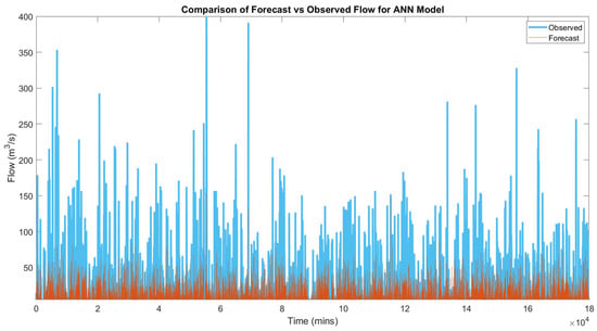 However, the best performance of the model was discovered with the novel method when applying rates of change as the target values. The regression value for training was the highest, 0.9545, while the error values were the lowest. The NSE value was the highest, 0.9090, while the RMSE was the lowest at 2.9958 m3/s. The model was the most superior among the four models tested.