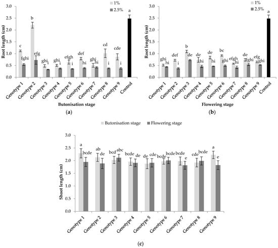 The allelopathic effect of sunflower extracts on the shoot length of lettuce seedlings is presented in Figure 2c with significant interaction for “growth stage × genotype”. Significantly higher reduction of lettuce shoot length was observed in treatments with Genotypes 1, 2 and 9 from the flowering stage compared to the butonisation stage. For the butonisation stage, the greatest inhibition was recorded with Genotypes 5 and 8.
