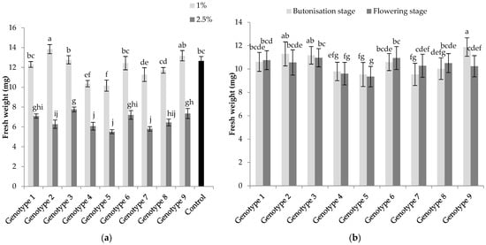 Allelopathic effect of water extracts from sunflower leaves on the fresh weight of lettuce seedlings: (a) “concentration × genotype” and (b) “growth stage × genotype” interactions. Columns with the same letters are not significantly different at p < 0.05.