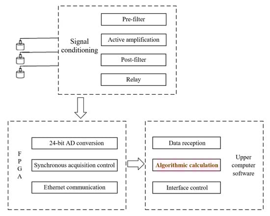 Figure 2 shows the schematic diagram of the triaxial micro-vibration real-time measurement system. In view of the characteristics of low amplitude of micro-vibration and the main energy being concentrated in the low-frequency band, three uniaxial acceleration sensors are selected to form a triaxial sensor module.