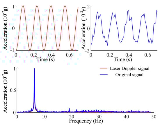 In order to verify whether the algorithm can effectively solve the problem that the micro-vibration signal is disturbed by noise, the linear sinusoidal excitation system is used to sinusoidally excite the sensor to output the standard sinusoidal signal. In order to verify whether the algorithm can effectively solve the problem of noise interference in micro-vibration signals, in this paper, we used a linear sinusoidal excitation system to excite the transducer so that it can output a standard sinusoidal signal. The measurement signal is compared and analyzed with that of the laser Doppler vibrometer. Figure 13 shows the schematic diagram of the comparative experimental scheme.