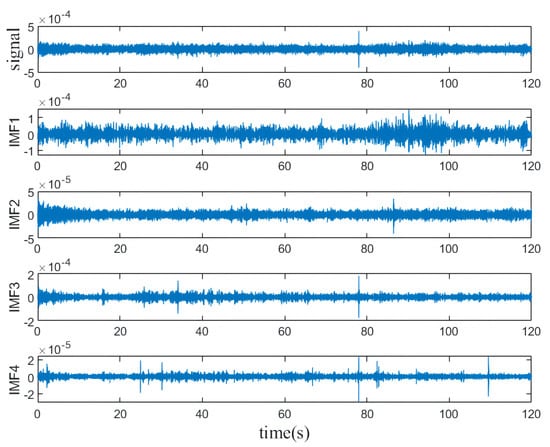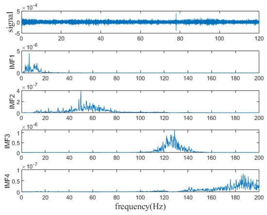 When the VMD algorithm is used to preprocess the micro-vibration signal, the VMD algorithm is first applied to the modal decomposition of the acceleration data. According to the improved VMD algorithm mentioned in Reference [20], the measured micro-vibration acceleration signal is decomposed into several orders of finite bandwidth eigenmode function component. Then, the frequency of each order of intrinsic mode function components is extracted by power spectral density to determine the frequency range of each order of intrinsic mode function components and eliminate the noisy modes. Figure 4 shows the measured micro-vibration acceleration signal, which is decomposed into several order intrinsic mode function components by the variational mode decomposition algorithm. Figure 5 shows the spectral diagram of each order of intrinsic mode function signals.