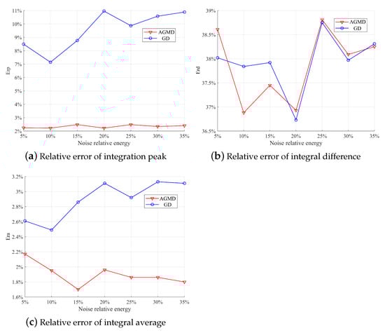Figure 10 shows the integration accuracy comparison between the denoising algorithm of spectral morphology fitting based on variational mode decomposition and the denoising algorithm of the symmetric Gaussian curve spectral morphology fitting. Figure 10a shows that the relative error of integration peak of the denoising algorithm proposed in this paper is significantly lower than the denoising algorithm of the symmetric Gaussian curve spectral morphology fitting. The relative error of integration peak of the former is always less than 2.6%. The results show that compared with the other two denoising algorithms, the denoising algorithm proposed in this paper is more accurate in the reduction of signal peak.
