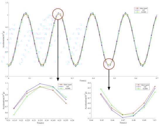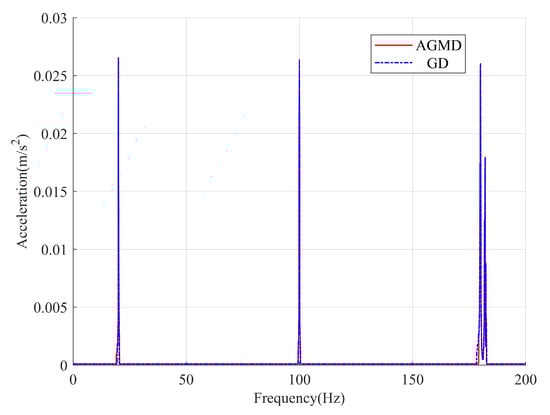As can be seen from Figure 5, the essence of the VMD algorithm is to decompose the acceleration signal into several intrinsic mode function components of different frequency bands. Each order of intrinsic mode function components obtained by the VMD decomposition algorithm have noise in other frequency bands with small amplitude. In this paper, we proposed a micro-vibration signal denoising algorithm of spectral morphology fitting based on variational mode decomposition (AGMD). The steps of the algorithm are as follows.