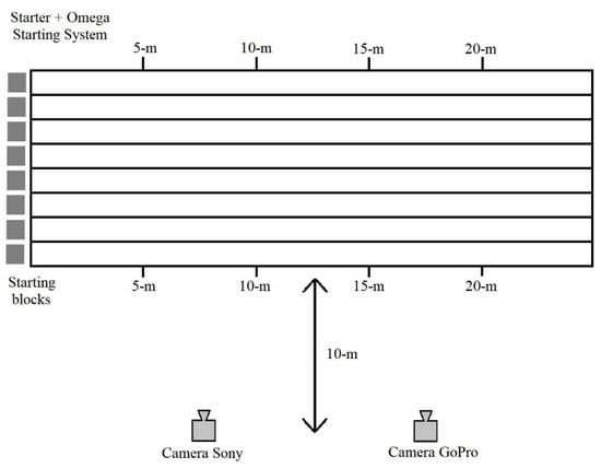 Before beginning the competition, points were marked on the side edges of the pool at a distance of 5, 10, 15, and 20 m from the starting wall (Figure 1). Two filming devices were placed on stable tripods: Sony DSC-RX100M3 (Sony Group, Tokyo, Japan) and GoPro Hero 9 Black (GoPro Inc., San Mateo, CA, USA). Both cameras were set at a distance of approximately 10 m from the side wall of the pool, at a height of approximately 6.5 m in relation to the water surface. Their lenses were directed perpendicularly to the direction of the subjects’ movement. The Sony device (filming mode, frequency 60 frames/s, resolution 1920 × 1080) was placed in such a way as to record the course of the athletes’ movements in the zone 5–10 m from the starting wall. The GoPro camera (linear filming mode, frequency 60 frames/s, resolution 1920 × 1080) was set in such a way making it possible to register the course of motion over a distance of 15–20 m from the starting wall. At the time of the starting signal, the starter judge was visible in the lenses of both devices, using the starting system emitting both a sound and a light signal to indicate the beginning of the race.