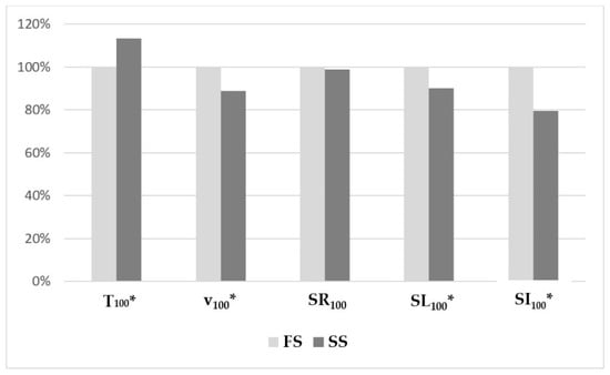 The subjects from the FS and SS groups differed in terms of age. Regarding the variables from the 100 m race, differences were found for the T100, v100, SL100, and SI100. For the above-mentioned indicators, a high value of Cohen’s d-effect was noted. The SR100 index was similar in both groups.