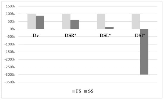 Differences between groups in terms of DSR, DSL, and DSI (large effect sizes for all mentioned variables) were noted. It was not shown that the Dv index differed significantly between the groups (moderate effect size).