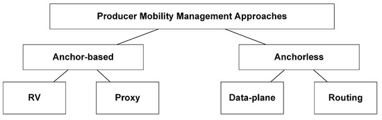 In general, based on how producer mobility management is performed, the producer MM schemes proposed in the literature may be classified into two broad categories: an anchor based category, which relies on a central entity to handle producer mobility, and an anchorless category, which does not require any central entity to handle producer mobility. Furthermore, anchor-based schemes may follow a rendezvous (RV) approach, in which a central entity keeps track of the location of the mobile producer in the network, or a proxy-based approach, where all communications with a mobile producer must pass through the proxy. Anchorless schemes, on the other hand, may apply either a routing-based approach, which includes updating of the FIBs along the path from the consumer to the producer, or a data-plane based approach, where the path leading to the producer’s new location is re-established using the data plane.