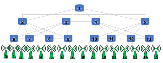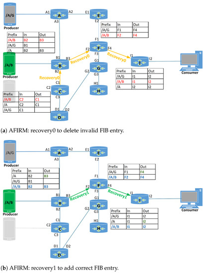 The AFIRM scheme was proposed for IoT sensors, where the name prefixes have many common sub-prefixes (to indicate a common site of the IoT sensors for example). This naming scheme was not applied in our simulation, and the name prefixes of the producer are of one syllabus (/prefix0 for instance). Therefore, the flooding process in the “FIB construction phase” would not generate any sub-prefixes. Thus, no additional hints about the producer would exist in the FIBs other than the original one-syllabus prefix. Furthermore, upon recovery0 propagation, the only hint associated with the producer was deleted from the path. Thus, recovery1 was broadcasted in most routers due to lack of any matching prefix in the FIB.