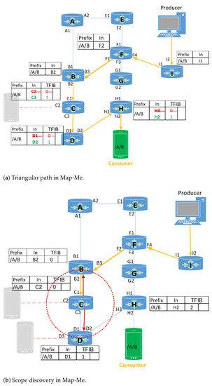 In [34], the authors propose an MM approach to handle producer and consumer mobility. During producer mobility, a control packet is sent along the reverse direction of the interest packet’s transmission path. A control packet uses the face specified in the PIT to propagate and changes the faces in the FIB. Among consumer mobility, a control packet is sent along the reverse direction of the data packet’s transmission path. A control packet uses the face specified in the FIB to propagate and changes the faces in the PIT.