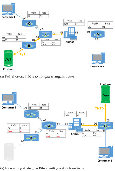 - Zhang, Y.; Zhang, H.; Zhang, L. Kite: A mobility support scheme for ndn. In Proceedings of the 1st ACM Conference on Information-Centric Networking, Paris, France, 24–26 September 2014; pp. 179–180. [Google Scholar]