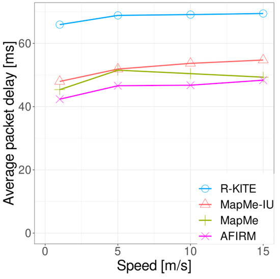 The resulting data retrieval delay from the producer mobility as a function of speed are shown in Figure 7 when handled by the AFIRM, Map-Me-IU, Map-Me-IN, and R-Kite schemes.