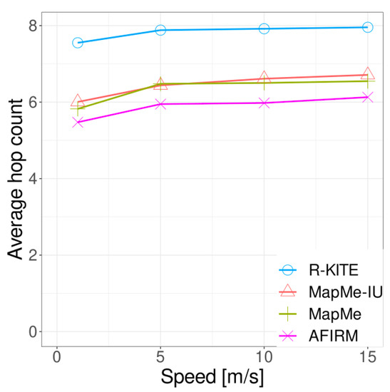 After producer mobility, an effective MM scheme would assure reachability to the mobile producer by a path that has a low stretch. We used the average hop count as one of the metrics to assess the performance of an MM scheme, as it is an important metric and has a direct impact on other evaluation metrics, such as the delay. Specifically, a certain delay in data delivery may result from the increase in the path length caused by the underlying MM scheme.