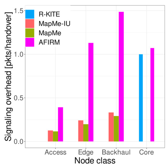Indeed, the signaling overhead for the Map-Me variations was lower than AFIRM in the access, edge, and backhaul classes. Map-Me-IU only requires IU packets to traverse between the producer’s new PoA and its old PoA. In addition, no Map-Me-IU signaling overhead propagates to the core router because the scheme works on edge routers. However, although it was foreseen that Map-Me-IN would generate a higher overhead than Map-Me-IU, due to the use of IN packets, this did not hold in the shown figure. The reason for this was that IN packets were excluded from counting, as they did not propagate further than the access routers and thus it did not generate overhead in the network. Additionally, the scope discovery interest broadcasting was performed in a specific situation where the consumer interest reached the old PoA before the IU packets. Therefore, only a few instances of the scope discovery process were performed during the simulation duration, and thus the amount of signaling overhead caused by scope discovery was negligible.