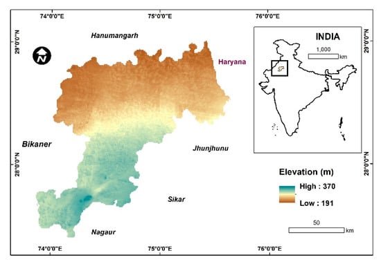 The present study area encompasses the entire Churu district in the Indian state of Rajasthan. It covers a total area of 13,835 km2 and stretches from 27°24′ North to 29°00′ North in latitude and from 73°40′ East to 75°41′ East in longitude [34]. Except for the northeast, the study area is surrounded by different districts of Rajasthan. In the west and north, it shares a district boundary with Bikaner and Hanumangarh, while in the southeast, south, and southwest, it is bordered by the Jhunjhunu, Sikar, and Nagaur districts, respectively (Figure 1). In the northeast, it shares the state boundary with Haryana [34]. In terms of its topography, this region may be divided into three distinct sections: the Taal area in the south, the Plains of Matiyars in the north, and the Desert area in the central portion [34]. Agro-climatically the region is categorized as an arid western plain zone of Rajasthan, India [35]. The climate of the arid western plain is characterized by a large seasonal temperature swing, with temperatures reaching as high as 49 degrees Celsius in the summer and as low as −1 degrees Celsius in the winter and typical annual rainfall reaching as low as 350 millimeters [34].