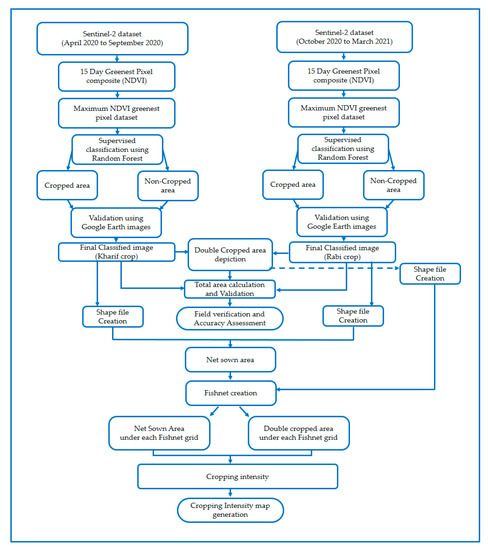 Agricultural activity is closely related to a number of physical and anthropogenic factors [1,2,3,4,5]. To maintain the balance between available land for cultivation and increasing demand for food in the recent era, both physical and anthropogenic factors are symbiotic and crucial [6,7,8]. In developing countries like India, agricultural lands are either fragmented into smaller parcels or limited for agricultural land expansion [9,10]. Hence, increasing cropping cycles in similar land parcels is the most effective way to increase crop production and ensure food security. Cropping intensity is one of the important aspects that define the level of intensification in agriculture [11,12,13]. Thus timely and accurate depiction of cropping patterns and cropping intensity can play a significant role in handling management practices not only for the present but also for the future. Multi-temporal satellite data is the feasible source of timely, cost-effective, and relatively accurate information in spatial extent regarding the present cropping systems. Using multi-temporal and multi-sensor remote sensing data, many researchers have demonstrated that it is possible to map cropping patterns, crop rotation, and other agricultural practices [14,15,16,17]. A remote sensing and geographic information system approach was adopted to depict cropping pattern mapping in Tumkur Taluk using the NDVI Technique [18]. The study showed how to employ remote sensing and GIS to map crop patterns and suitability. Cropping information is derived from Landsat 8 data using NDVI and supervised classification. The analysis considered the drainage, slope, and current crop activity maps as important aspects. The study concluded that ragi, coconut plantation, and paddy fields had a definite relation with water resource potential and crop suitability maps that helps farmers in achieving a high spatial yield. Few studies focused on integrating remote sensing and GIS to analyze the impact of cropping patterns on the environment [19]. The information used in this study was from both field observations and observations made via remote sensing. According to the findings, during the summer months, the region exhibited a uniform cropping pattern; most of the district was left fallow; the three most important crops were fodder, dhaicha, and sunflowers. During the winter months, the areas that exhibited a dissimilar crop pattern underwent a dramatic shift. A phenology-based technique was developed in studies to identify double-cropping fields by analyzing time-series Moderate Resolution Imaging Spectroradiometer (MODIS) images from 2000 to 2020 with the Google Earth Engine [20]. The findings revealed that throughout the course of the past 20 years, the northern limit of double crop (NLDC) has usually trended both eastward and southward. The study provided a scientific foundation for the continued expansion and strategic planning for agricultural production in China. Scholars also used Sentinel-1 data with Google Earth Engine to classify croplands [21]. Using the random forest technique, 76.88% accuracy was obtained with a kappa score of 0.728. The study concluded that the Sentinel-1 images are accurate enough for cropland classification and identifying paddy field cropping patterns. Rice area, cropping patterns, and growth stages in Southeast Asia were attempted using Sentinel-1 Time Series on a Google Earth Engine platform [22]. Overall, the rice extent was measured, and a kappa coefficient of 0.92 was achieved. The study concluded that Support Vector Machine (SVM) and Artificial Neural Networks (ANN) outperform the random forest. The authors also suggested that simple and robust technology might be used to replace time-consuming, expensive field surveys across Southeast Asia. A method was developed to use Google Earth Engine and the random forest classifier to create a map of irrigated land [23]. During 2018/19 and 2019/20 winter growing seasons, the Normalized Difference Vegetation Index (NDVI) was subsequently employed to distinguish between irrigated and rain-fed lands. The study incorporated ground-based training samples and Very High-Resolution Images (VHRI). The overall accuracy of classification was 88%. Using deep learning and the Google Earth Engine, a few studies focused on the Sentinel SAR-optical fusion for crop-type mapping [24]. The results demonstrated that integrating multi-temporal SAR and optical data gives overall greater training accuracy for crop-type mapping than either multi-temporal SAR or optical data alone. Application of the Google Earth Engine using Sentinel imagery and neural networks was attempted for crop mapping in Canada [25]. In this study, the Google Earth Engine cloud computing platform was employed for the first time in conjunction with an Artificial Neural Networks (ANN) algorithm using Sentinel-1 and Sentinel-2 images to generate an object-based annual space-based crop inventory map for 2018. The study revealed that further research should be conducted on the proposed cloud computing technology since it is more efficient in terms of cost, time, calculation, and automation. Google Earth Engine cloud computing was also adopted to automate the mapping of Africa’s croplands using satellite imagery [26]. The researchers used a 16-day time series of MODIS NDVI data at a resolution of 250 meters over the whole African continent. The study concluded that MODIS 250-m time-series data could rapidly map cropped areas; however, there are currently inadequate reference data to report trends from these results in a systematic manner. For understanding the temporal dynamics of spatial heterogeneity over agriculture using time-series NDVI, near-infrared and red reflectance of Landsat 8 OLI images were used [27]. The results showed that before planting, the NIR and red variables detect a similar degree of spatial heterogeneity in the cropland, with comparable values of the variability in mean length. The st