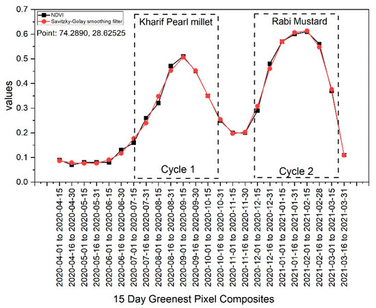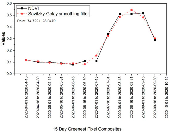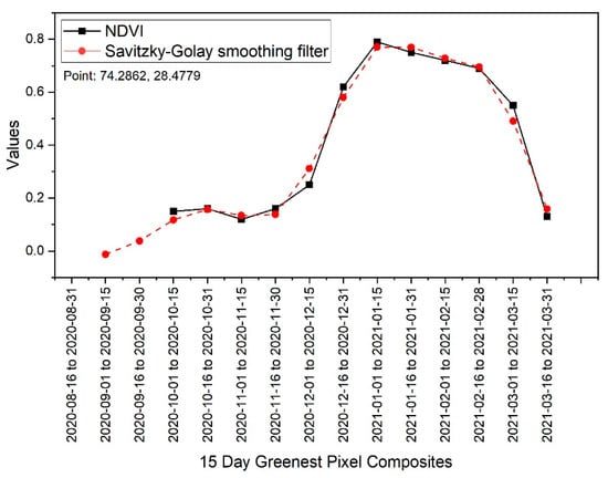 The presence of clouds and atmosphere are major noise sources in the NDVI data sets. For the smoothening of the temporal greenest pixel NDVI curve, the Savitzky–Golay filter (S-G filter) was applied. The filter adopts the local polynomial least square fitting method to smoothen the temporal curve [40]. The S-G filter for the smoothening of multi-temporal NDVI was performed in the Origin software (Figure 4, Figure 5 and Figure 6).