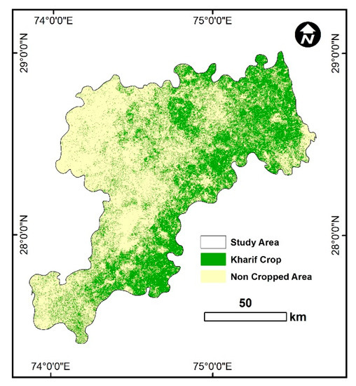Initially, the shape file of the study area was prepared in the Arc GIS environment from the state map of Rajasthan, Survey of India [36], with the WGS 84 UTM 43N zone projection system and imported into the Google Earth Engine code editor. For the present study, Harmonized Sentinel-2 MSI: Multispectral Instrument, Level-2A collection was used. Sentinel-2 is an imaging mission that supports the Copernicus Land Monitoring studies. These studies include monitoring vegetation, soil, and water cover, as well as the observation of inland waterways and coastal areas. Sentinel-2 has a wide field of view, high resolution, and multiple spectral bands [37]. For the Kharif season, satellite images from April 2020 to September 2020 were considered, while images from October 2020 to March 2021 were selected for the Rabi season. For every 15 days, images were filtered considering less than 10% of cloud cover. The QA band was used to remove cloud cover from the incorporated data [37].