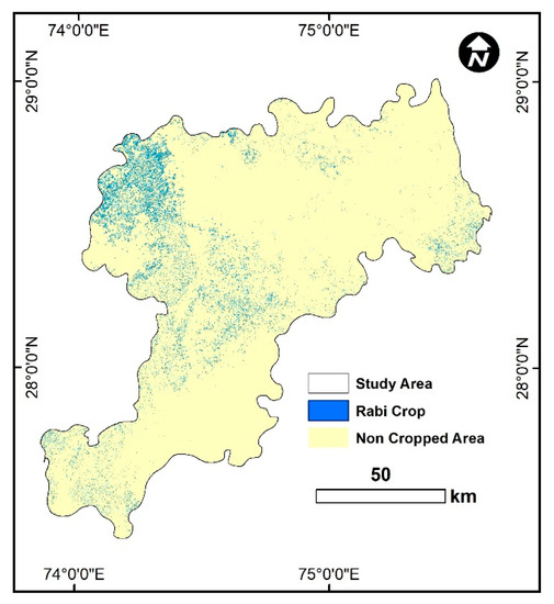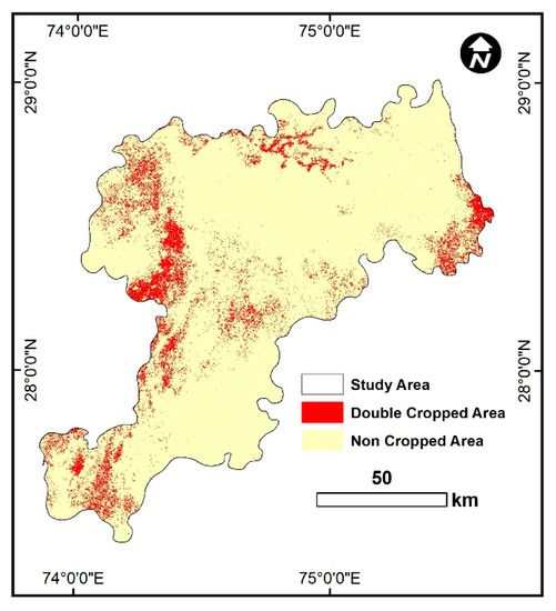 All the GIS-related operations were done in ArcGIS 10 software. For the Kharif season, a unique field was included in the attribute table with a value of 2 for all the cropped area (polygons) and 0 for the non-cropped area (polygons). In the similar way, for the Rabi season, a unique field was included in the attribute table, and all the cropped areas were assigned a value of 3 and the non-cropped areas as 0. The generated vector layers were in union with each other so that a single vector file could be generated. In the generated vector layer, another column was added, and all the unique values of the Kharif and Rabi seasons were summed together. In this column, all the polygons with value 0 signifed the non-cropped area, 2 depicts the Kharif season crops, 3 shows the Rabi season crop, and 5 depicts double season crops. A separate double-cropped area vector layer was prepared for future use. A 10 km × 10 km fishnet was generated over the final vector layer, and (considered as net sown area) tabulate intersection analysis was processed on the data set to compute the cropped area under each of the fishnet blocks. A similar process was applied to the double-cropped area vector layer. For the computation of the gross cropped area of each of the fishnet blocks, the net sown area of the respective block was added with the area under the double crop of the same fishnet block.