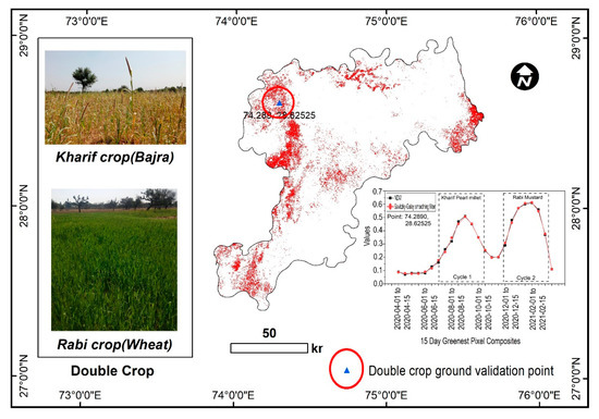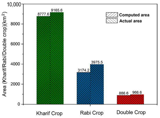 Two different kinds of ground-based references were collected to validate the cropland extent and the cropping intensity. Information concerning the cropping pattern at the village level and the total area planted with crops was gathered from every tehsil land record office in the study region. The area under Kharif, Rabi, and double crop were compared with the computed values and represented in Figure 10.