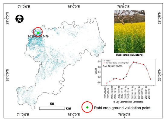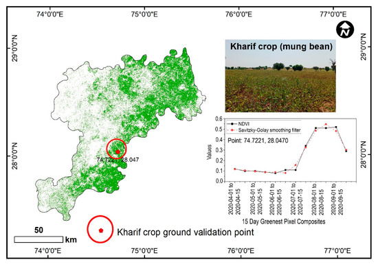 where is the reconstructed dataset, is the coefficient of the filter, is the original value, n is the window width, W is the number of data in the moving window (2n + 1). Once the maximum NDVI greenest pixel dataset was identified, cropped areas were depicted, and signatures were generated for the cropped and non-cropped areas, followed by image classification using the random forest technique. After the first iteration of classification, the entire area was thoroughly assessed for misclassification through visual interpretation and validated using Google Earth images. The misclassified pixels were further classified correctly, and the final iteration was processed. The generated classified map also calculated the total cropped area for Kharif and Rabi seasons. The generated classified image was downloaded from the Google Earth Engine code editor. For Kharif and Rabi seasons, a similar process was adopted.