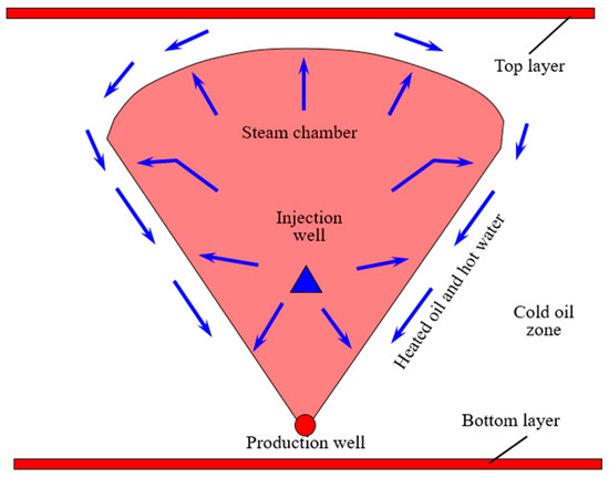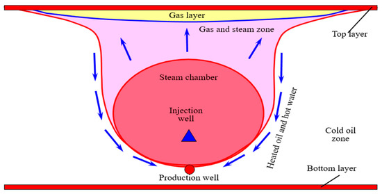 - Increase formation pressure and replenish formation energy. A certain amount of nitrogen can effectively replenish the formation energy and maintain the pressure during steam injection, thus prolonging the huff-and-puff period and increasing the average pressure drop [92]. The mixed injection of hot steam and CO2 makes full use of the characteristics of large elastic energy in gas flooding, which can make up for the pressure reduced by steam condensation, so as to maintain the formation pressure. At the same time, CO2, as a non-condensate gas, can continuously replenish the formation energy, improve the formation pressure, and accelerate the flowback rate of fluid in the process of the end of the soaking well [96]. Figure 6 shows the SAGP technology of a heavy-oil reservoir [97].