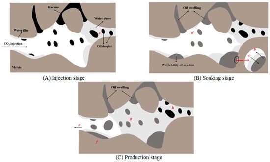 The process of CO2 huff and puff could be divided into three stages: the injection stage, soaking stage, and production stage [20,21]. The process of CO2 huff and puff is presented in Figure 3. More detailed processes are as follows: (a) oil droplets are pushed to the depth of the reservoir by CO2, (b) the light component is extracted by CO2, (c) CO2 is dissolved in the heavy components, (d) oil droplet expansion, (e) Flow direction of liquid, (f) residual oil due to changes in rock wettability, (g) oil droplets generated by crude oil expansion during production, and (h) oil droplets are displaced from the deep formation by the water phase.