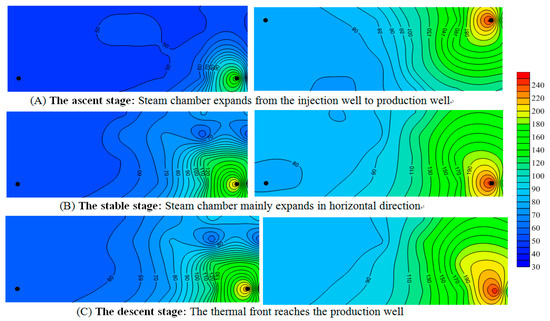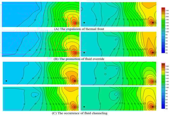 - Insulate and reduce heat loss. The density of CO2 is less than the density of steam [92]. N2 has a low thermal conductivity. Hence, both gases provide excellent heat insulation. Therefore, injecting a certain amount of non-condensate gas during steam injection can act as a heat insulation in the oil casing annulus and reduce heat loss in the wellbore. Non-condensate gas will preferentially occupy the top space of the reservoir to form the overlying phenomenon, so that the steam heats the cold oil area of the stratum, slows down the steam overlying effect, expands the steam sweep range, and improves the heat utilization [93]. Figure 4 and Figure 5 show the temperature field distribution after N2 injection into formation [94]. Figure 4A shows that the steam chamber extends from the injection well to the production well, Figure 4B shows that the steam chamber mainly expands in the horizontal direction, and Figure 4C shows that the thermal front reaches the production well. Figure 5A shows the expansion of the thermal front, Figure 5B shows the promotion of fluid override, and Figure 5C shows the occurrence of fluid channeling.