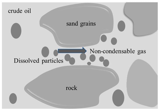 - Help to remove blockage and increase seepage capacity. N2 has good displacement property, gas lift, and drainage functions due to its good expansibility. CO2 is weakly acidic when dissolved in water, which becomes more acidic at high temperature. It reacts with the formation matrix, and acid decomposes some impurities, and removes the pollution near the well zone. In addition, it can also dissolve the mineral components such as calcite and dolomite in the rock, thus enlarging the pores between mineral particles and enhancing the seepage ability of the rock [98]. After the non-condensate gas is injected into the formation, the process of dissolving the rock and increasing the seepage space is shown in Figure 7.