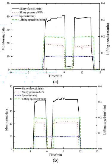 The monitoring sensors fixed on the drilling system contained a speed sensor and a depth sensor for monitoring the retracting velocity and rotation velocity of the drill, and the position of slurry spraying. The monitoring sensors fixed on the feeding system contained an electromagnetic flowmeter and pressure gauge for monitoring the pressure and flow rate of grouting, respectively, which recorded data every 10 milliseconds to calculate the amount of cement paste per second with principles of calculus, and to estimate the diameter of the jet grouting column. An automatic pulping station was used in the pulping system for real-time monitoring of the water:cement ratio. Figure 13 shows the installation of monitoring sensors.
