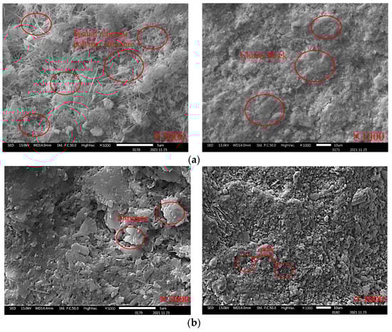 In Figure 20b, on the surface of the large particles and in the middle of the pores, there was an obvious rod-like or needle-like structure, which is a significant feature of the existence of ettringite. The structures in the system gradually connected to form a dense large block; therefore, the overhead pores could be easily observed. The positively charged Ca2+ provided in the RPCG, on the one hand, promoted the formation of ettringite and other hydration products; on the other hand, the positively charged Ca2+ and negatively charged soil particles combined to form colloidal condensation; however, there were voids in the internal structure of the soil, and the flocculant only attached to the granular units.