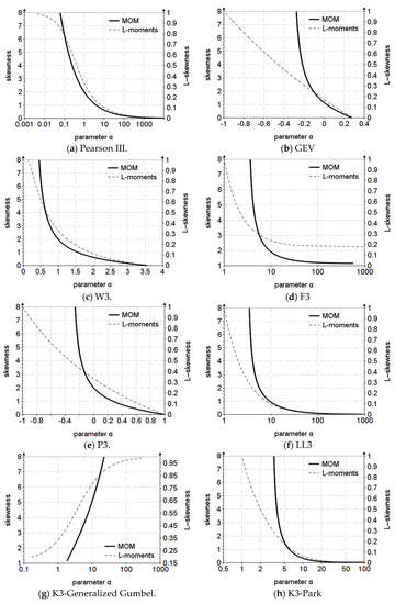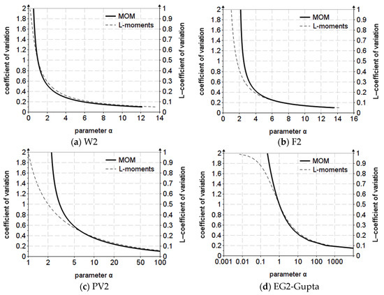 For two-parameter distributions, the definition range of the variable was determined as a function of for MOM and for L-moments. The limits of the definition domain of the parameter were established according to the extreme values of and , thus was calculated for , respectively, for . The functions and were plotted for both methods.