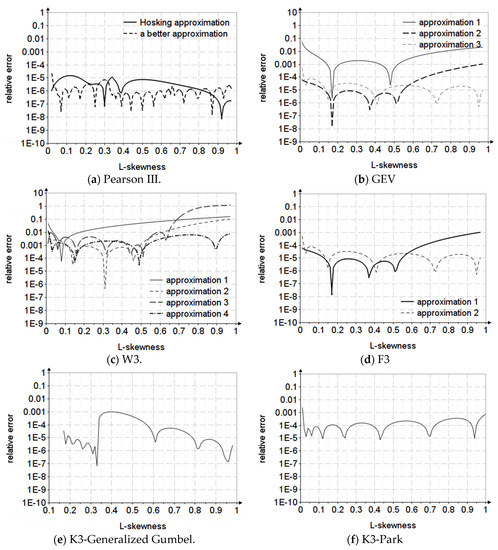 For the PV2 distribution for the L-moment estimation of the parameter, the approximation function adopted is of the polynomial function type with logarithmic argument with relative errors below 10−4.