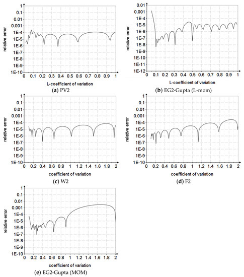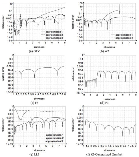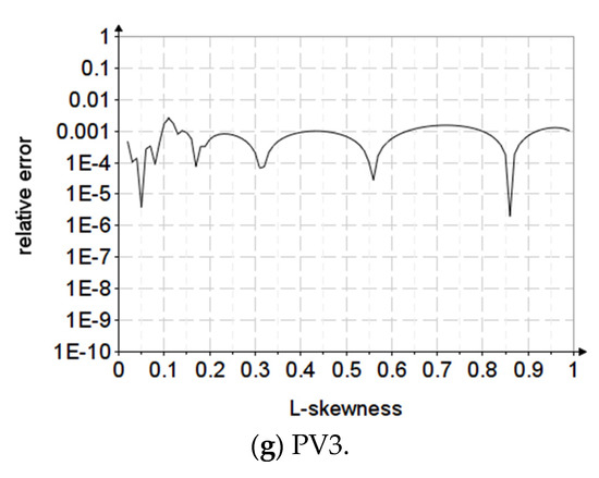For the method of ordinary moments, the approximation range most often used for skewness is 0–4, but in certain regions of the world they meet up to a skewness equal to 9 [3], or the skewness is adopted by multiplying the coefficient of variation with a chosen positive coefficient [10], so the skewness is always positive, even if that of the given sample may have negative skewness values. The definition range of approximations 0–8 was chosen in the case of MOM, and the definition range for the method of linear moments is the default 0–1. Considering that the approximation relations must be as accurate as possible, the relative error graphs are also presented. The relative error is the ratio between the difference between the exact and approximate value of the skewness, and the exact value. In this article, the new approximation relations are noted as “a better approximation”. For the L-skewness of the sample, it can have negative values, generally greater than −0.4.