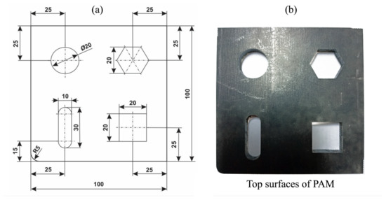 With the aim of obtaining a few geometries of the applied different machining tools, basic geometric shapes were adopted in the form of a circle, a hexagon, a combination of circle and rectangle, and a square, Figure 2.