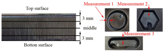 Quarter shapes of 100 × 100 mm are cut on each machine tool. Outer and all inner contours (inner geometric shapes) are cut clockwise. The aforementioned geometric shapes were used to determine the dimensional accuracy and kerf width for each type of machining. Cutting of each geometric shape as well as the base plate with dimensions of 100 × 100 mm was considered in the machining process. The surface roughness was measured at three positions of the cut surface. The first position is the distance from the top surface (1 mm for a 5 mm thick plate, 2 mm for an 8 mm thick plate, and 3 mm for a 10 mm thick plate). The second position is the center of the cut. Finally, the third position is identical to the first, only from the bottom side. An example of measurement when cutting 10 mm thick material by plasma processing is shown in Figure 3. The methodology for measuring the individual machining performances is shown in Figure 4.