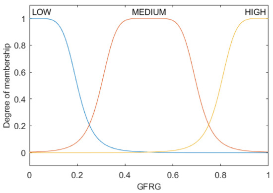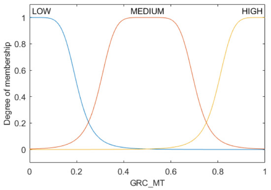 The second part of the GFA represents the logical system consisting of fuzzification, fuzzy inference system (rule base and membership functions) and finally a defuzzification. Fuzzification means that the crisp input values of are converted into appropriate linguistic values. In this case, the GRC coefficient values from 0 to 1 are divided into fuzzy sets or linguistic values, for example, LOW, MEDIUM, and HIGH. The fuzzifier uses the Gbell membership function to fuzzify the GRC of each feature. The mathematical form of this function is shown in Equation (7).