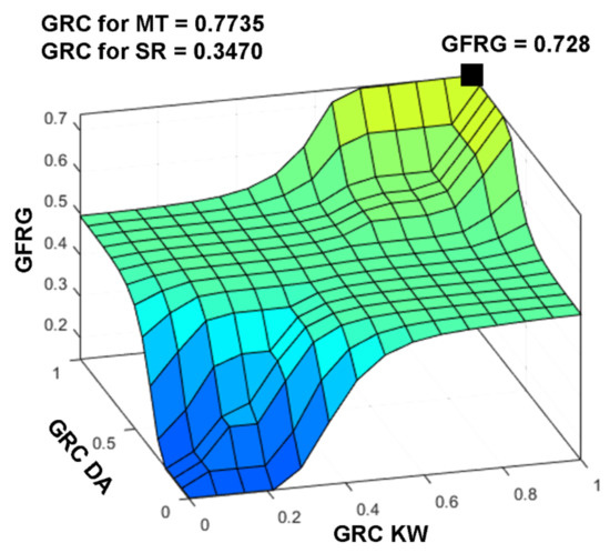 The third phase of the grey fuzzy relationship analysis involves the creation of fuzzy rules according to the experimental design. After determining the fuzzification, the input data with the conditions of the rules are determined and evaluated. The essential part of the fuzzy rule inference system is a set of IF-THEN linguistic rules that have the form “If (GRC_MT is HIGH) and (GRC_DA is LOW) and (GRC_KW is LOW) and (GRC_SR is MEDIUM) then (GFRG is LOW)”, where the first four terms in parentheses (antecedents) are grey relational coefficients containing linguistic variables. The fifth parenthesis represents the consequence. Starting from a larger grey relational coefficient indicating better performance characteristics, nine fuzzy rules are formed as shown in Table 7.