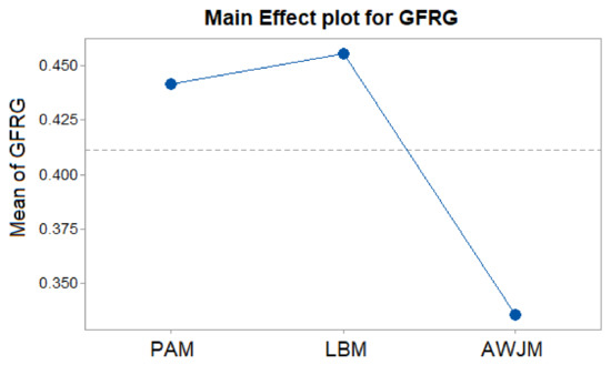 To test the similarity between the means of the level of the main factors, such as the type of cutting process, a main effect diagram was used. This diagram shows the effects of the main factors and their interaction on GFRG. In the main effects plot, it can be seen that the steep slope of the cutting process is the property that has the greatest influence on the estimation of GFRG, Figure 8. By observing the slope of the curve, i.e., the mean values, an analysis with fuzzy 3D diagrams was confirmed. It is concluded that the presented processing conditions are the most suitable for LBM from the point of view of technological parameters.