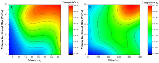 In polymer-based composites, the dielectric constant of the composites primarily depends on the dielectric constant of the matrix and filler, and filler’s volume fraction as shown in Figure 6. The combined effect of the dielectric constant of matrix and filler, and the volume fraction of filler on composite’s dielectric constant was studied using the ANN as shown in Figure 7a–c. When we set the x-axis and y-axis with the main variables, the other variables are fixed based on the most overlapping data, with a filler diameter of 200 nm, a filler dimension of 1D nanowire, a frequency of 1 kHz, and without a core–shell structure. Figure 7a,b show the combined effect of the dielectric constant of matrix and filler, and the volume fraction of filler, respectively. As we can estimate, the dielectric constant of the composite shows a typically proportional tendency to increase as the dielectric constant of the matrix and the volume fraction of the filler increase. In Figure 7b, there are some distortion contour lines. It is derived from insufficient data with the dielectric constants of filler between about 500 and 800. Despite the lack of data, it shows the tendency of the composite’s dielectric constant to generally increase as the dielectric constant and the volume fraction of the filler increase. When matrix and filler’s dielectric constant are considered together in Figure 7c, it shows the same tendency as in Figure 7a,b that composite’s dielectric constant increases as matrix and filler’s dielectric constant increase. Furthermore, it is presented to discuss the effect of minor variables such as filler’s diameter and shell’s thickness in Figure 7d,e. When it comes to filler’s diameter, the dielectric constant of the composite represents a general tendency to decrease as the filler’s diameter decreases. This is mainly attributed to the lowered dielectric constant of filler caused by decreasing particle size. The dielectric constant of nanofillers decreases with decreasing particle size due to depolarization fields, surface properties, electrical boundary conditions, and defects [55]. As for the effect of the shell’s thickness, it shows the tendency of the composite’s dielectric constant to decrease as the shell’s thickness increases. This is because in the core–shell structure, the shell reduces the high electrical mismatch between the filler and the matrix. Therefore, as the shell’s thickness increases, the electrical mismatch and the effect of filler introduction to increase the composite’s dielectric constant are reduced at the same time [56]. It can be seen in Figure 7a–e that the dielectric constant of the polymer composites through the ANN model can be predicted without a theoretical model or empirical measuring method regarding the major and minor parameters.