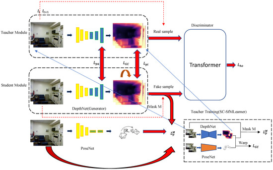 - Introduce the idea of a pose network into the student network to construct photometric loss, and Transformer as the discriminator of a GAN to capture holistic information.