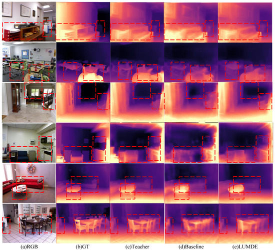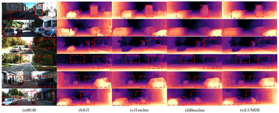 The qualitative depth maps are shown in Figure 2. It can be seen that the performance of the teacher network is closest to the ground truth, which is consistent with the quantitative results in Table 4. In addition, compared with the baseline depth graphs, our optimized network (LUMDE) presents better prediction capacity on the outlines of objects, and the baseline results are somewhat hazy in some areas.